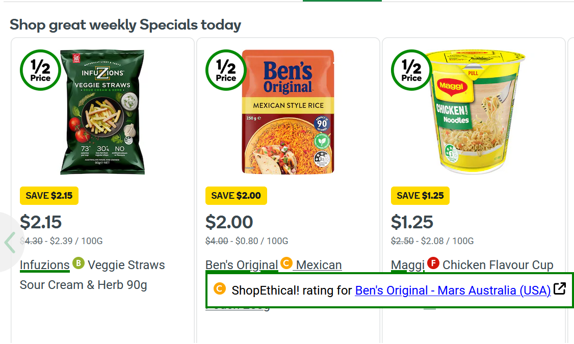 If you're among the 64% of Aussies who shop online sometimes, we are launching something to help you apply your ethical principles to your online shopping. Our new browser extension places Shop Ethical! company ratings right on the page where you're shopping, whether it's for groceries, technology, clothes, stationery, or just about anything! How it works: